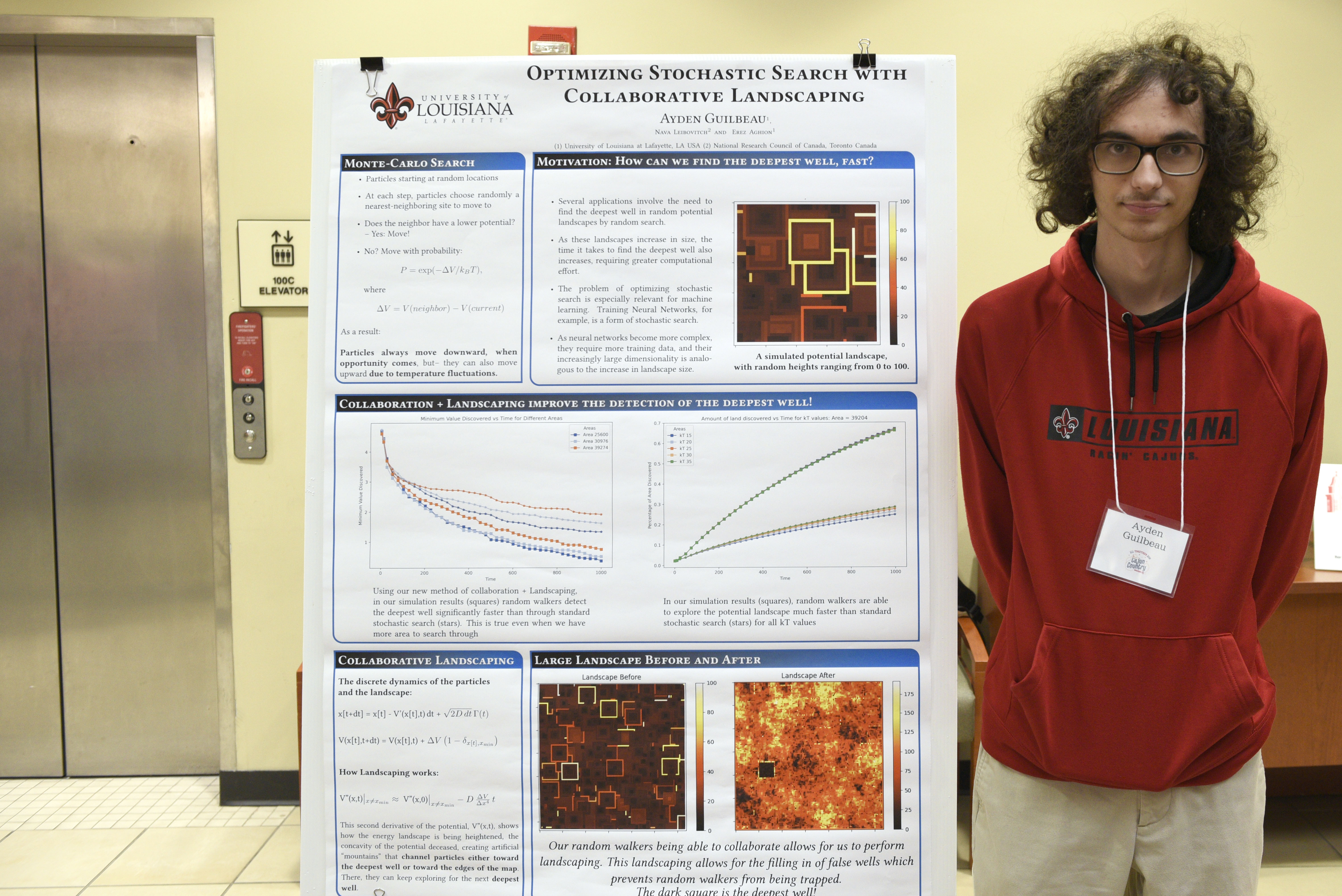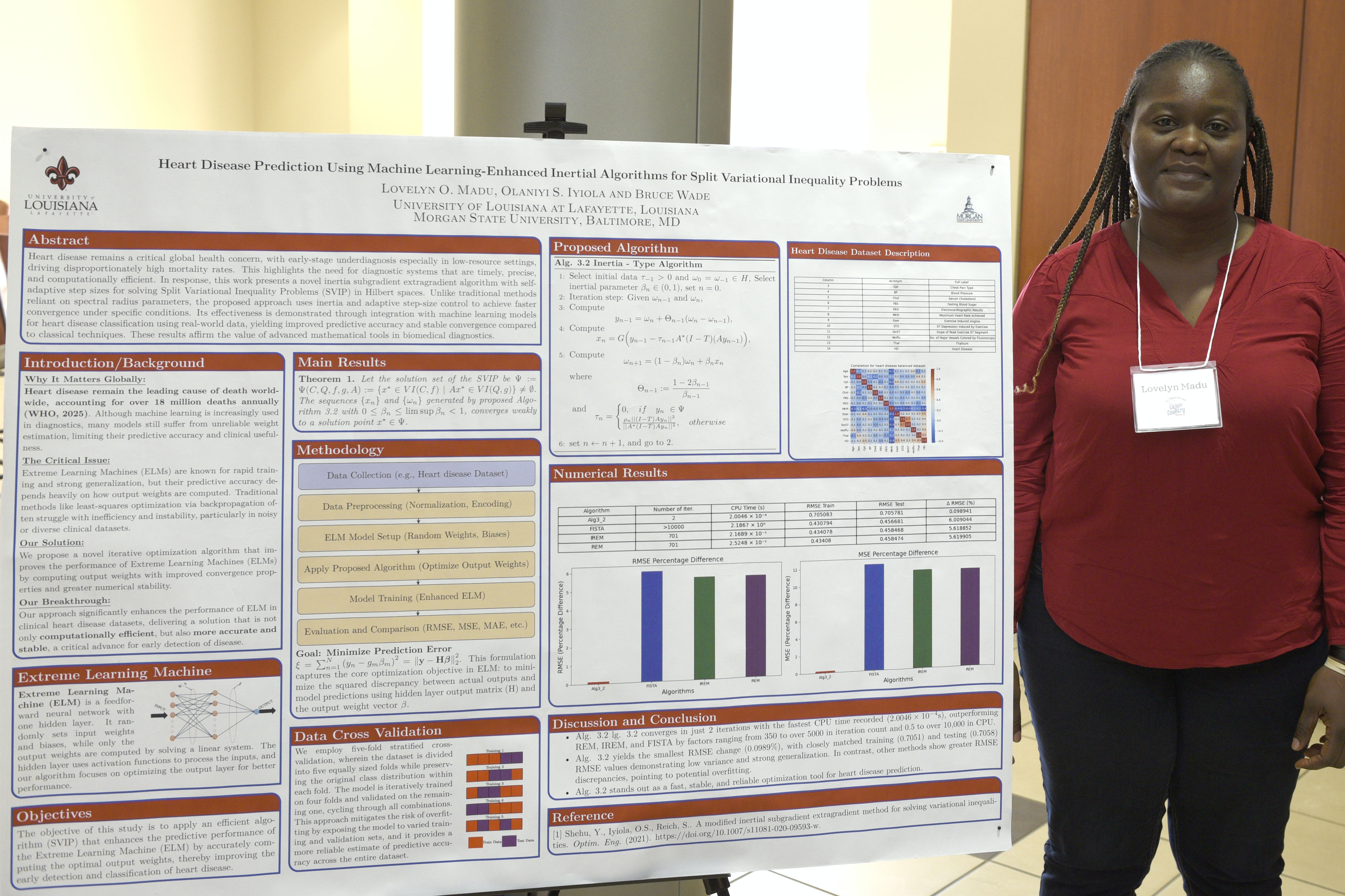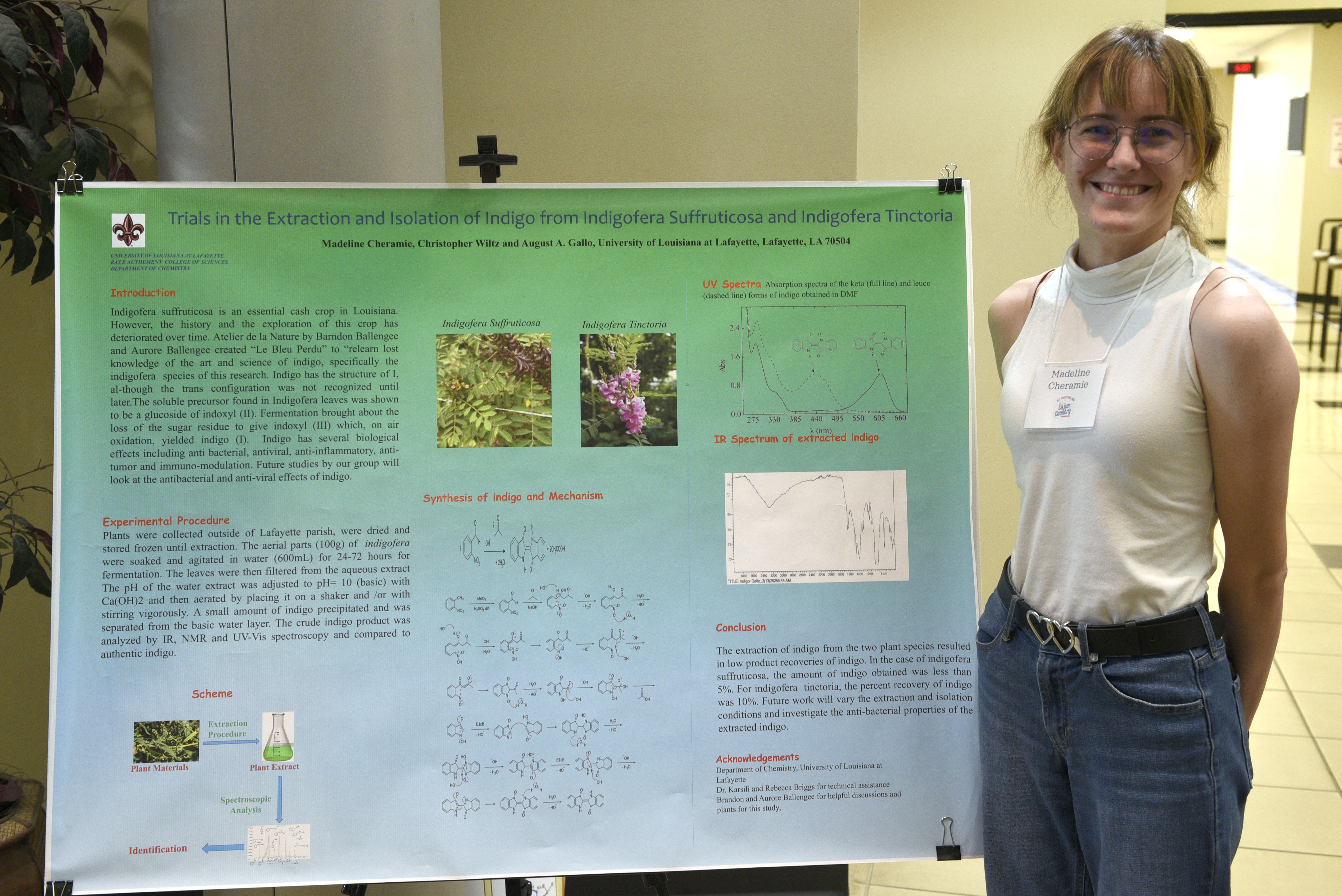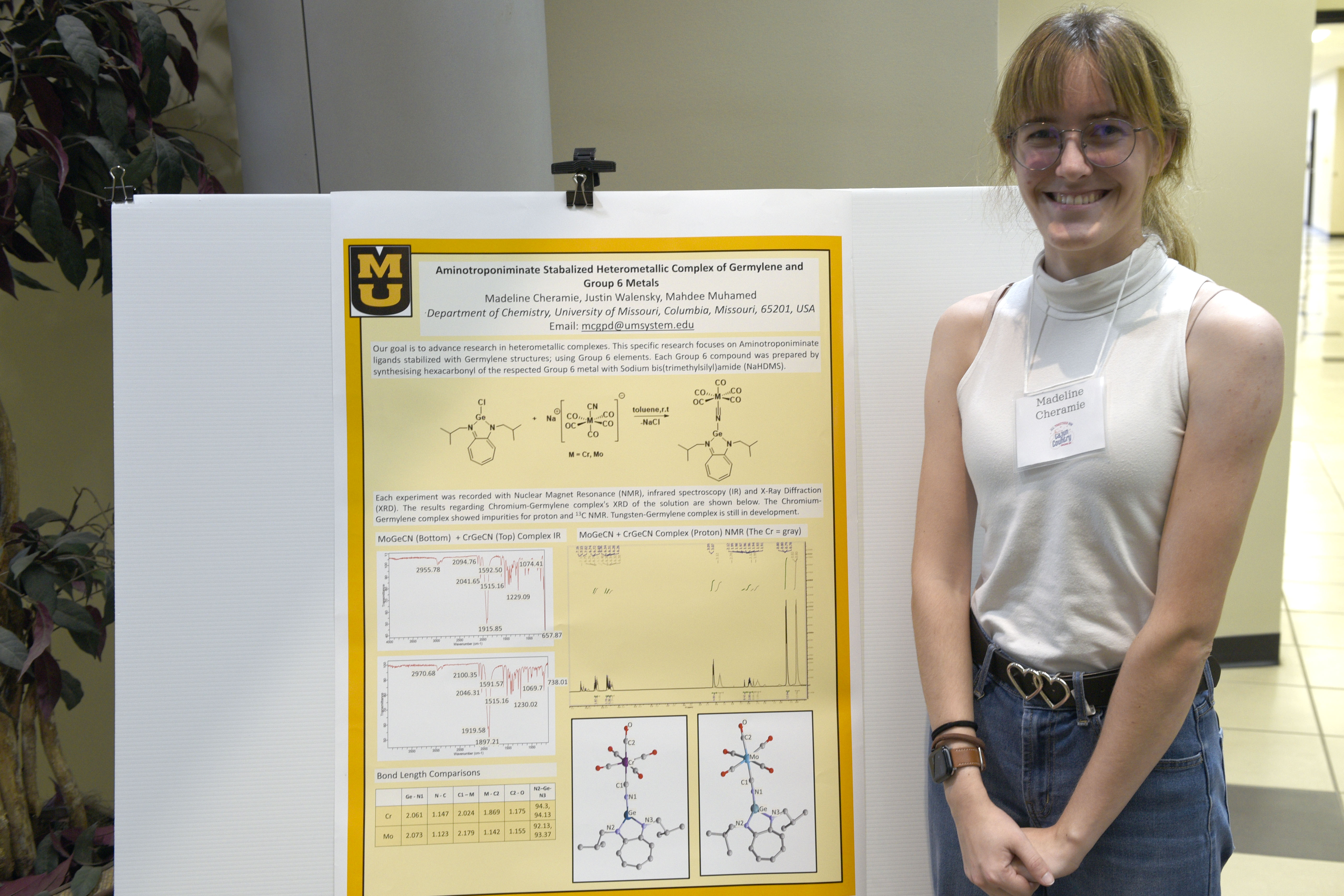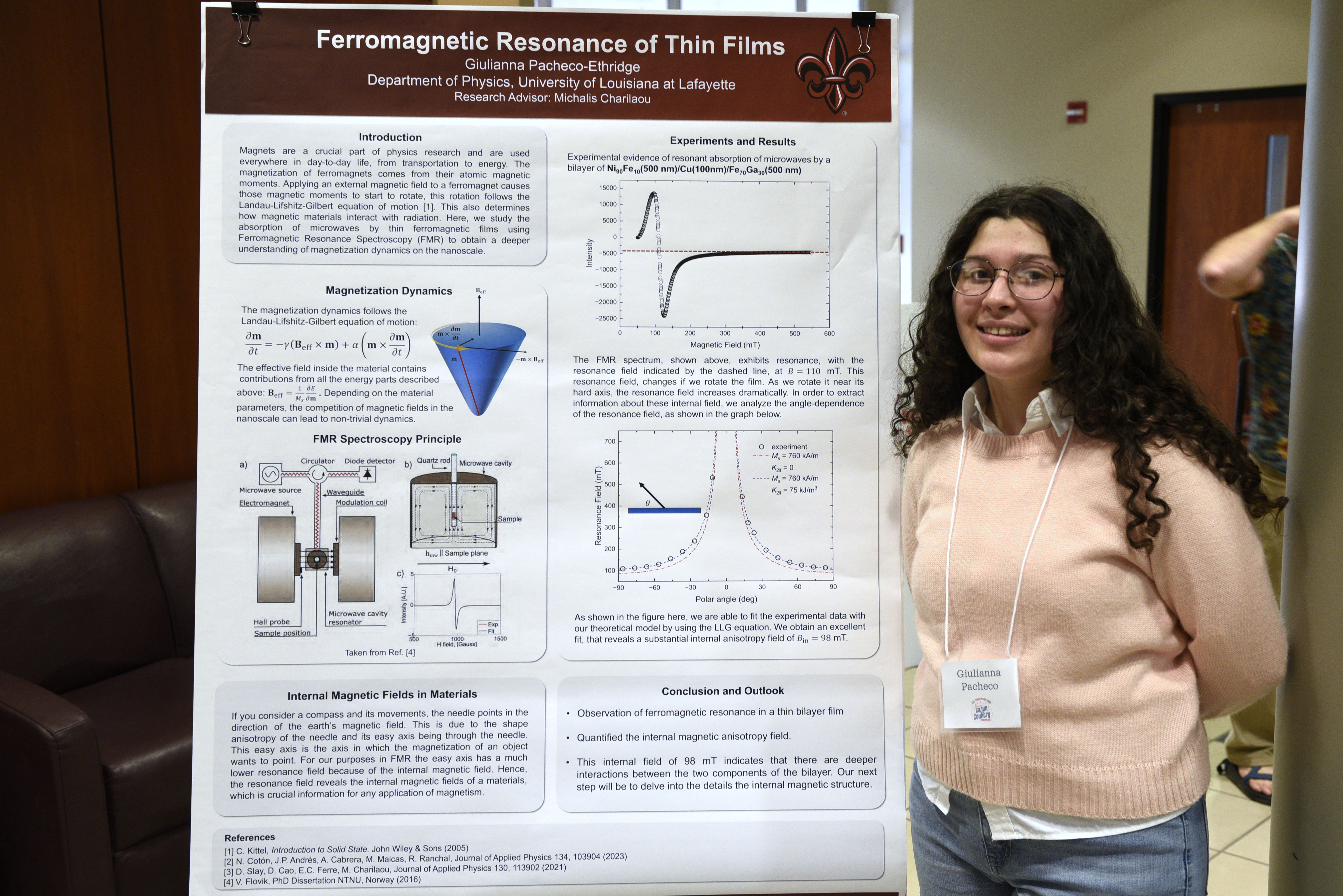 Tue, 11/04/2025 - 9:24amOn the evening of Thursday, 16 October 2025, we celebrated the research activities of our undergraduate and graduate students at a research poster presentation and reception. Student researchers exhibited eighteen posters and explained their research to the visitors. A large group of alumni, students, faculty, and friends of the college were able to attend this exciting and informative event. Photos of the presenters with their posters are provided below. Please visit the Fall 2025 Student Research Poster Presentation and Reception page to view some additional photos showing interactions between the visitors and the presenters and some reception photos.