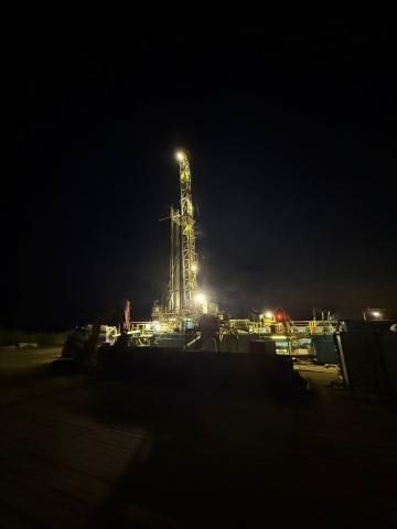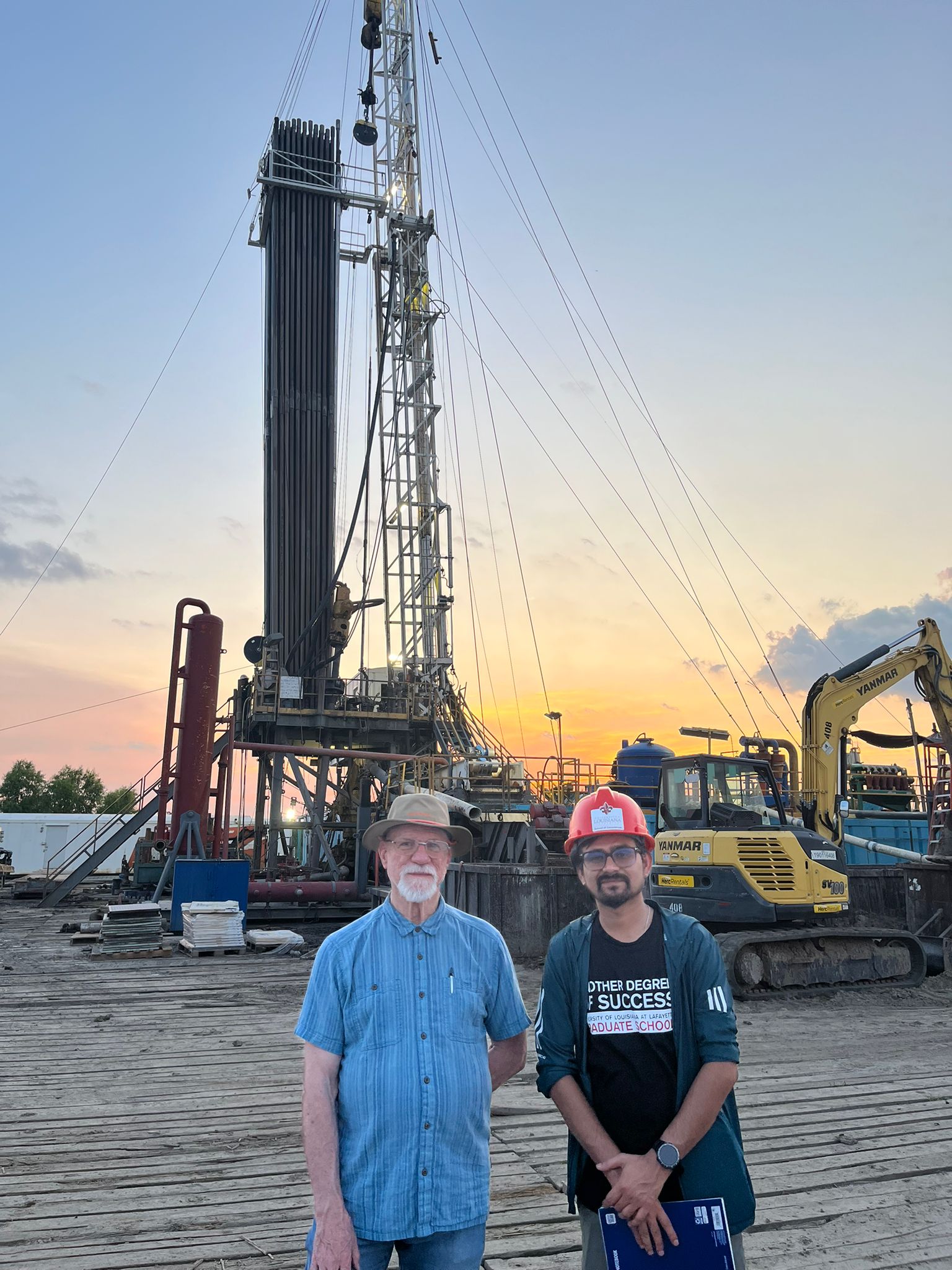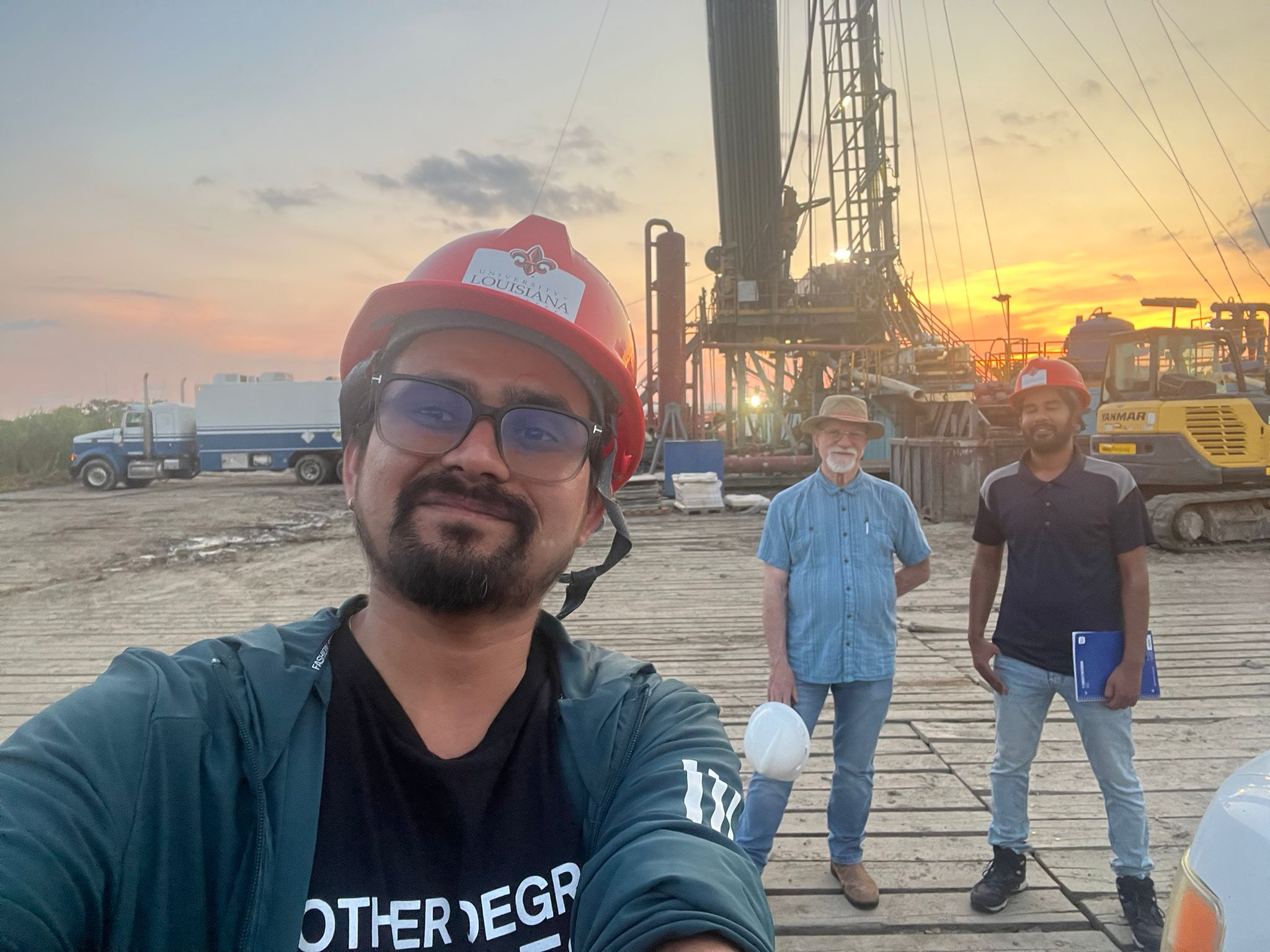 Fri, 11/21/2025 - 7:12amOn August 8th, two of our Geosciences graduate students, Ujjwal Kharel and Hamza Rehman, had an amazing opportunity to visit an exploration well in Cameron Parish, Louisiana. Ujjwal and Hamza are recipients of the Enhancing Excellence in Subsurface Geology Non-Endowed Scholarship which is funded by Miami Alternatives, LLC, on behalf of the Deering Family. This was the first time that either of these students had the opportunity to visit a drill rig. Their faculty mentor, Mr. Bill Finley, accompanied them on their visit to the well site.